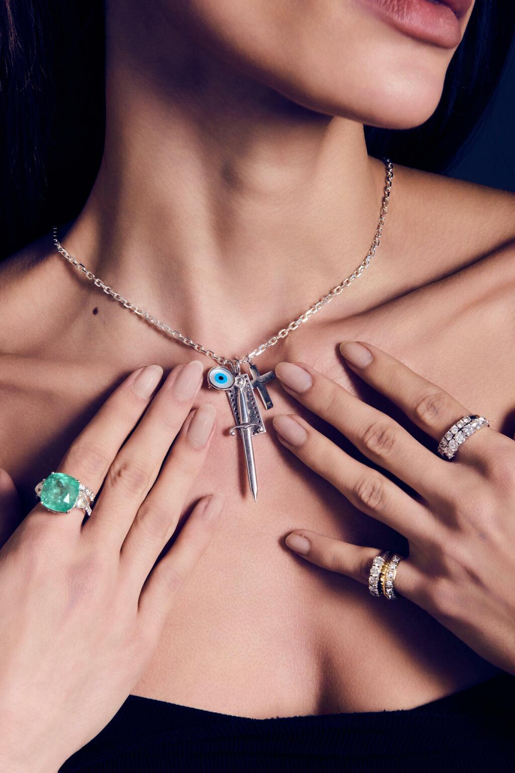 Anel em ouro branco 18k, 12.53 quilates de Esmeralda colombiana em lapidação cushion e 1.91 quilates de Diamantes.